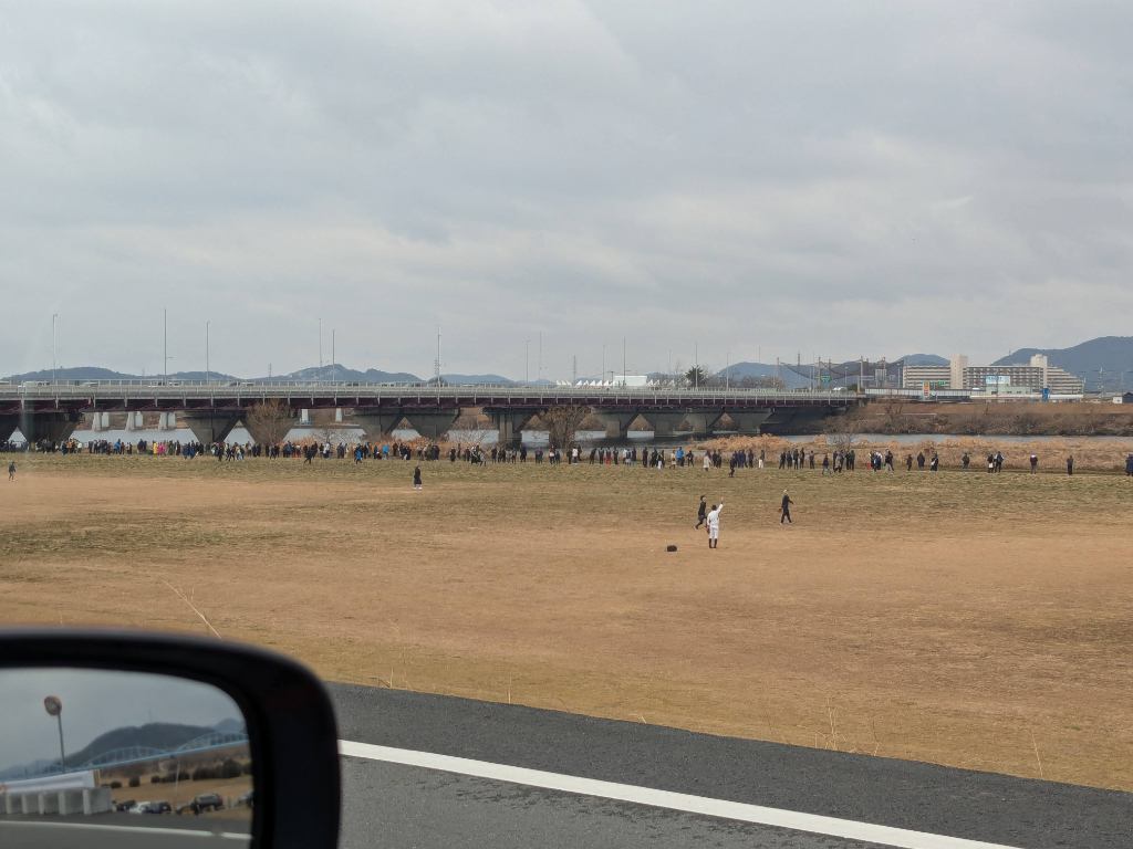 河川敷を見るとこの状態。何かあるなとは思い調べてみると、「男子第79回・女子第40回 兵庫県郡市区対抗駅伝競走大会」が開催されているようで、その関係者や観客が駐車場を利用し駐車場が満車になり駐車場待ち渋滞となっていました。