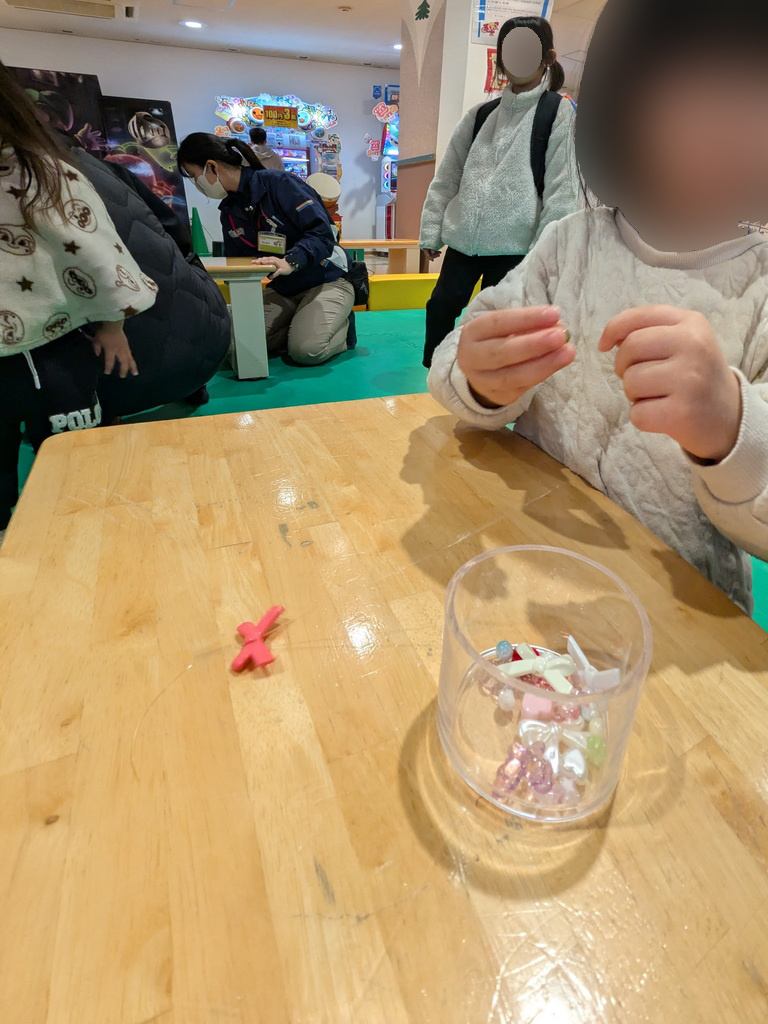 本日は14時から「せかいで、1つだけのブレスレットをくつろう」という体験があるので、ゲームセンターでブレスレットを取り続けて100個以上ある我が子の目は輝き、午前はイオンモール加西北条でスーパーボール救いをしていたもののイオンモールからイオンに移動。