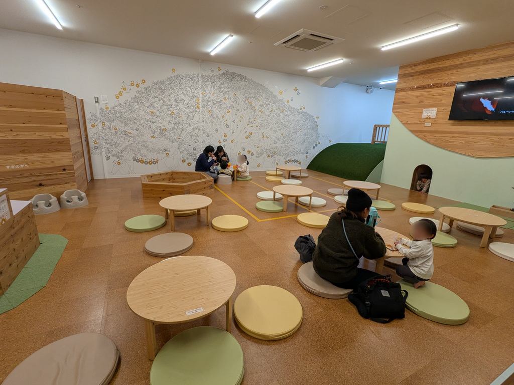 基本的にある程度自分で歩き回れる子どもの遊具が多いですが、小さな子供も楽しめる絵本スペースもあります。絵本は多くはありませんが、多数の子どもが遊んでいました。ただし、このスペースに年齢制限はないため、大きな子供が走り回ってくることもあるのでお気をつけください。