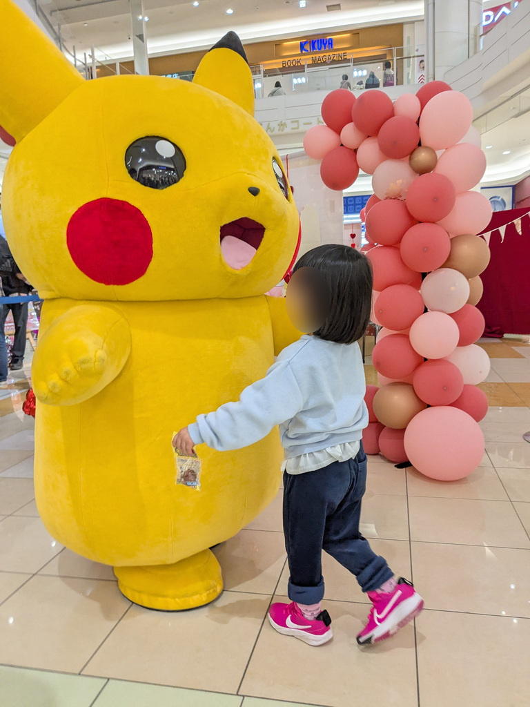 1階の廊下を歩いているピカチューを発見し、子どもと共に追いかけると、エスカレーター前の広場で携帯電話や電気の契約の販促イベントでピカチューが拘束されているようでした。