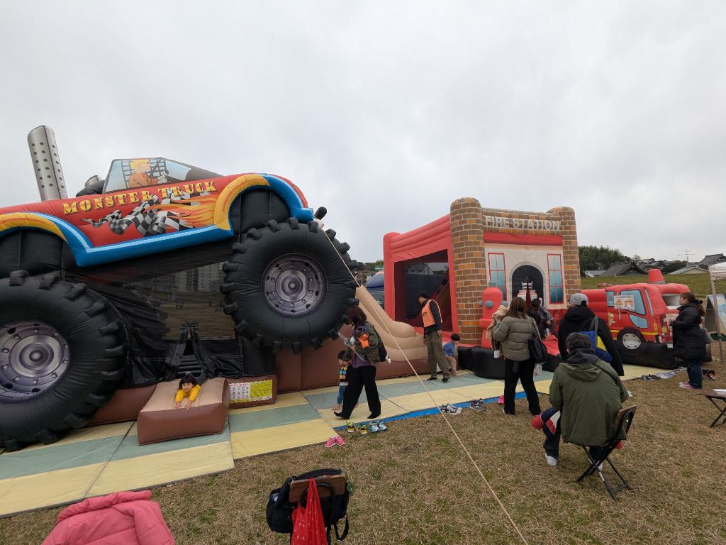 ビヨンビヨンの空気の遊具も同じものが来ておりましたが、その他は地域性の違いか全く異なり、フラワーセンターはどちらかというと手作り体験が多いうという感じでしたが、こちらは色々な雑貨や遊びが用意されていました。広さもコチラのほうが大きかったかと思います。