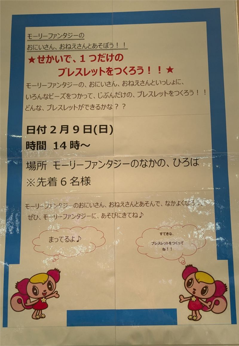本日は14時から「せかいで、1つだけのブレスレットをくつろう」という体験があるので、ゲームセンターでブレスレットを取り続けて100個以上ある我が子の目は輝き、午前はイオンモール加西北条でスーパーボール救いをしていたもののイオンモールからイオンに移動。
