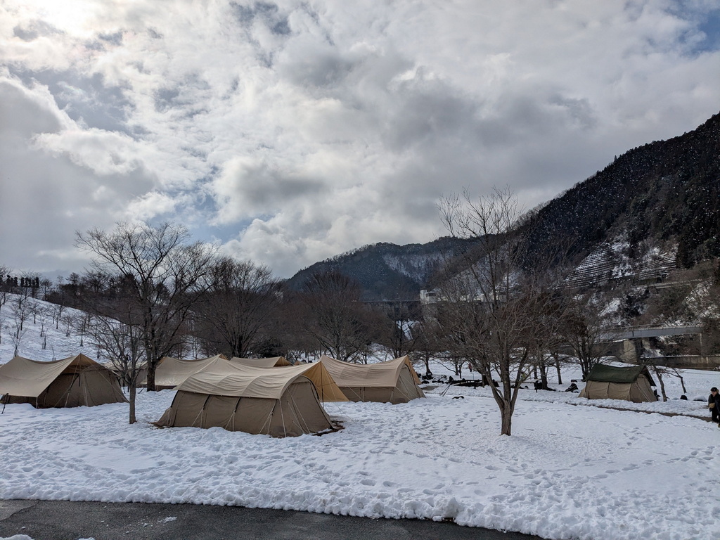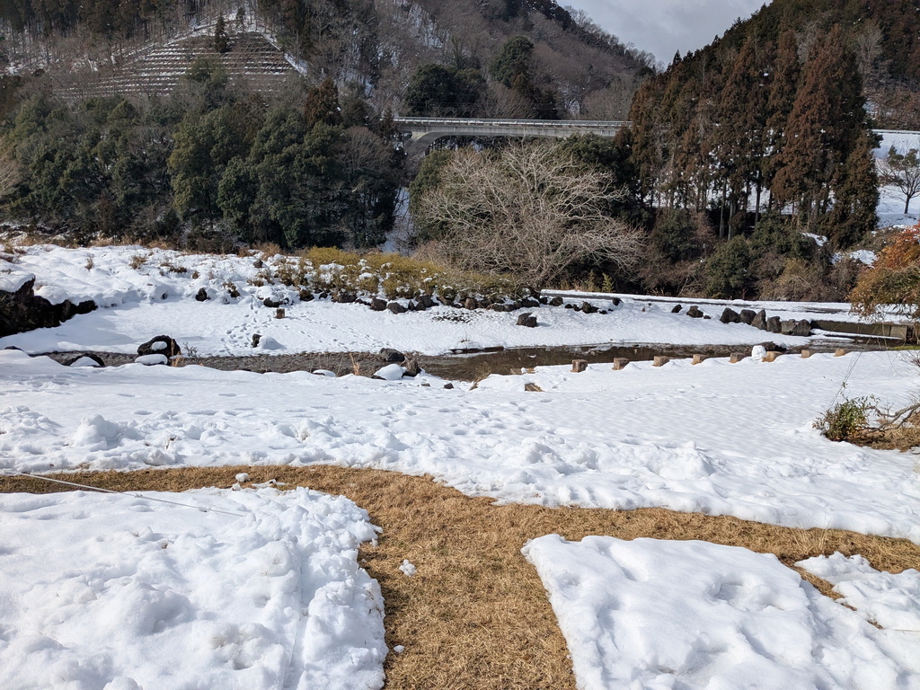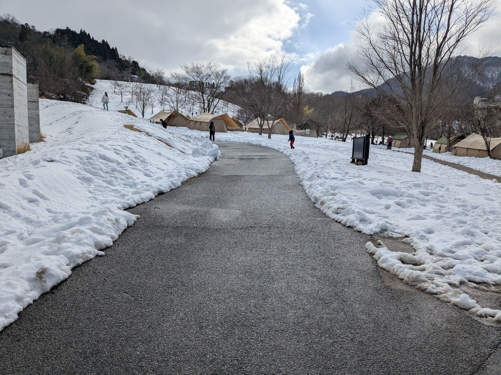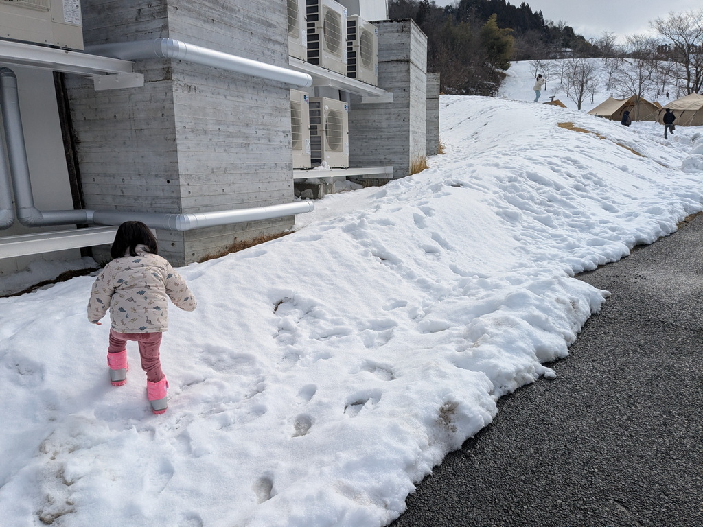 スプリングスひよしに到着すると、期待通りに積雪があり、それをすでに楽しんだあとでそこら中に大きな雪だるまが設置されていました。また、玄人はソリや簡易的なスキー、スノーボードを持ち込み、広場の傾斜で楽しそうに遊んでいました。私も次回の積雪があれば絶対にソリを持っていきたいです。