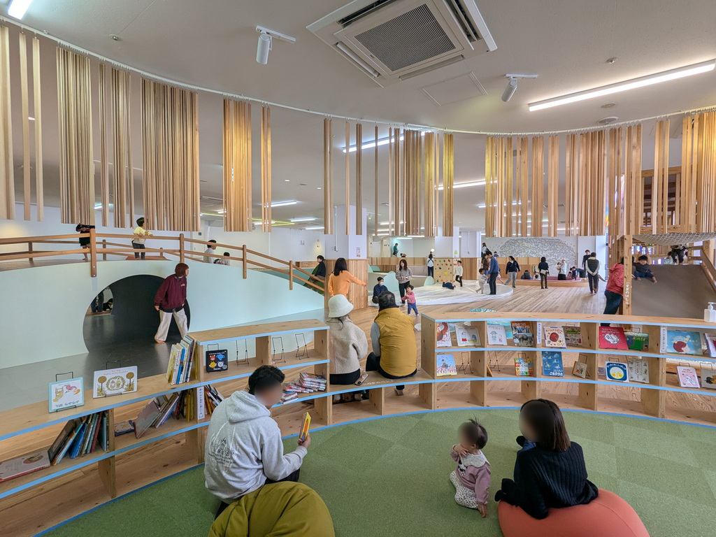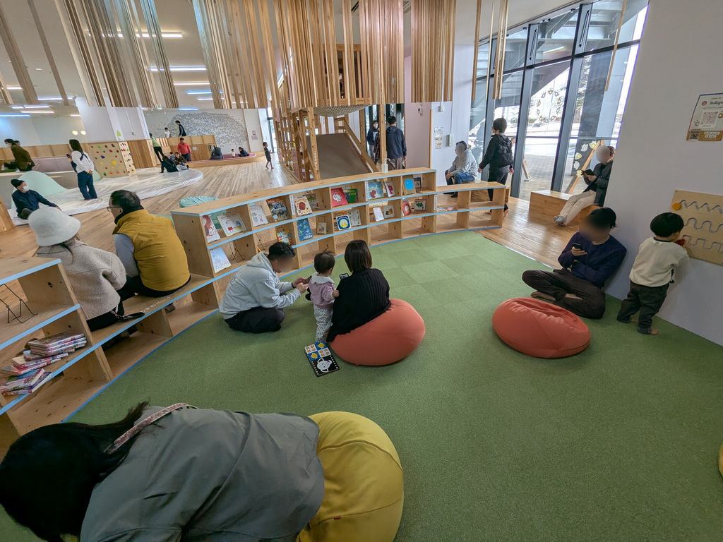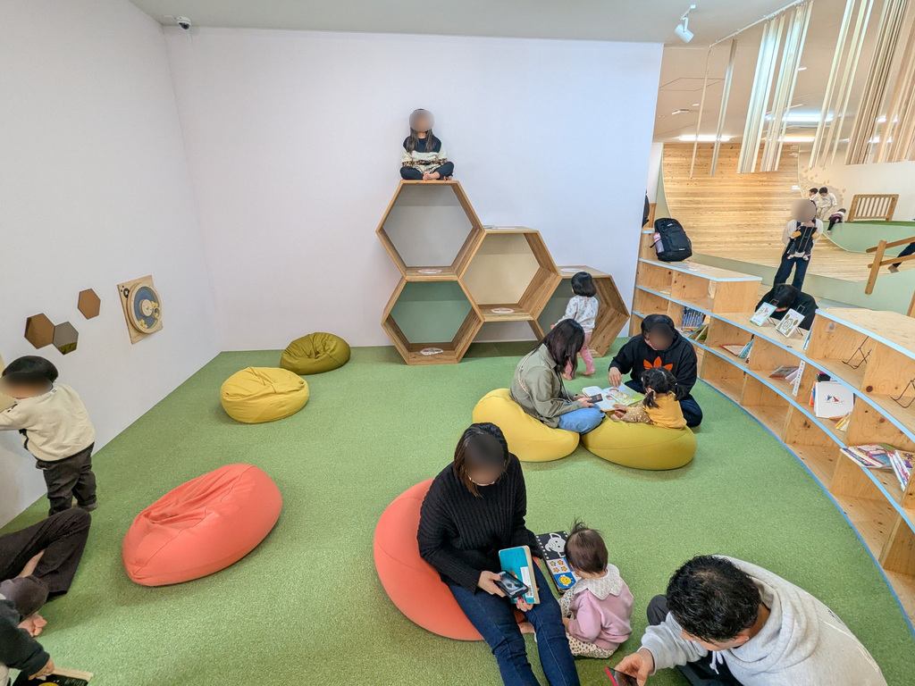 基本的にある程度自分で歩き回れる子どもの遊具が多いですが、小さな子供も楽しめる絵本スペースもあります。絵本は多くはありませんが、多数の子どもが遊んでいました。ただし、このスペースに年齢制限はないため、大きな子供が走り回ってくることもあるのでお気をつけください。