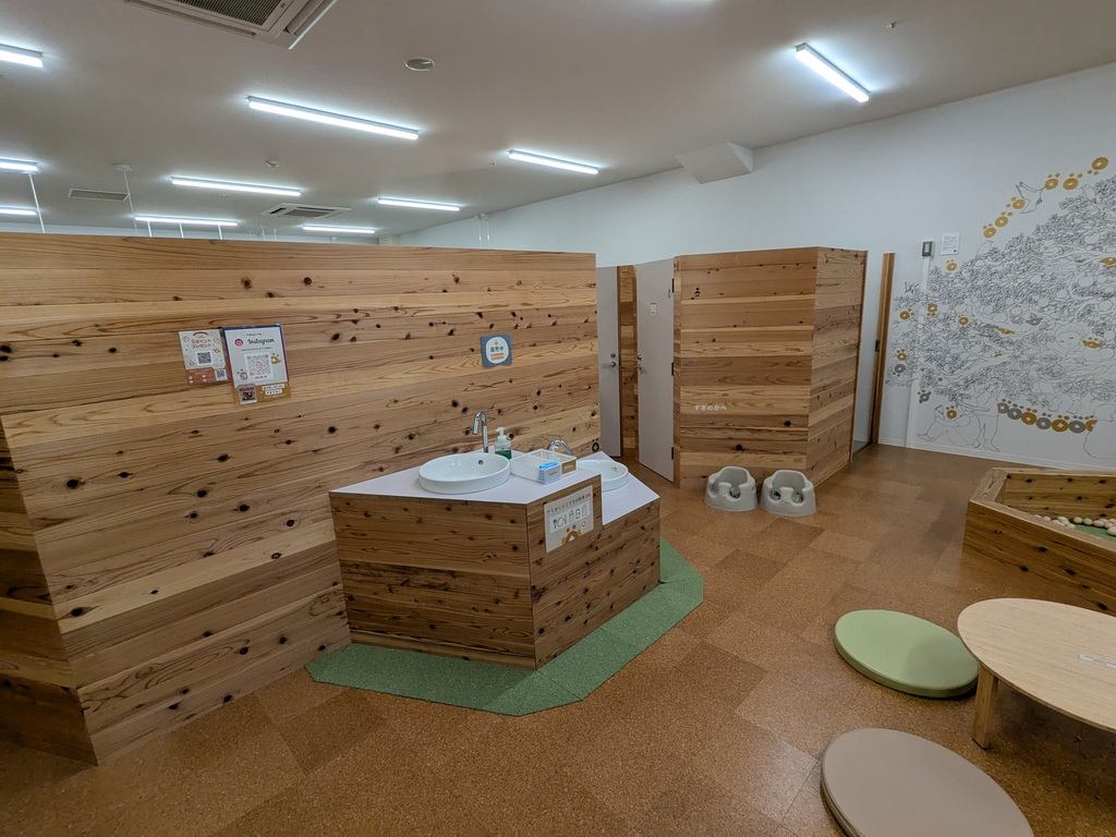 おむつ替えスペースは食事スペースの真横にあります。食事スペースの真横でオープンなため人目にはつきますが、非常に使いやすい配置になります。ちなみに手前の扉が未就学児用トイレの扉です。