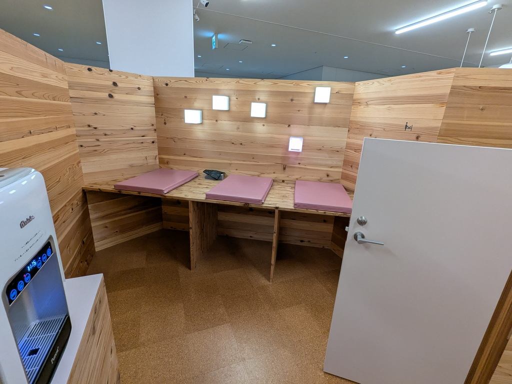 授乳スペースはトイレの奥にあり、ミルク用のお湯も用意されています。飲食スペースからは見えない位置に設置されているため、お探しの場合はトイレに進んでいただくと見つかります。
